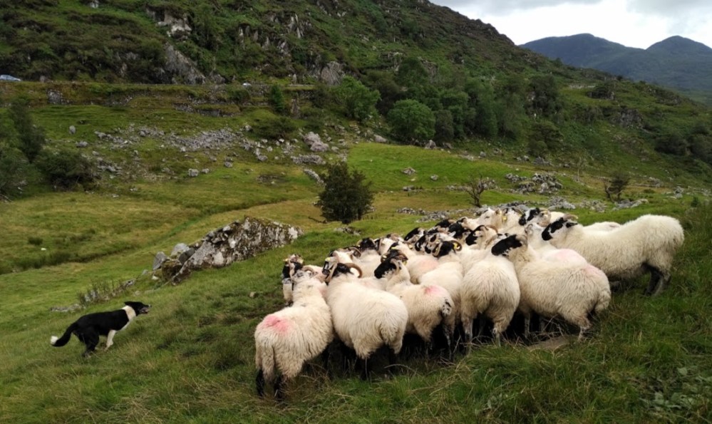 A dog rounds up the sheep at Kissane Sheep Farm in County Kerry