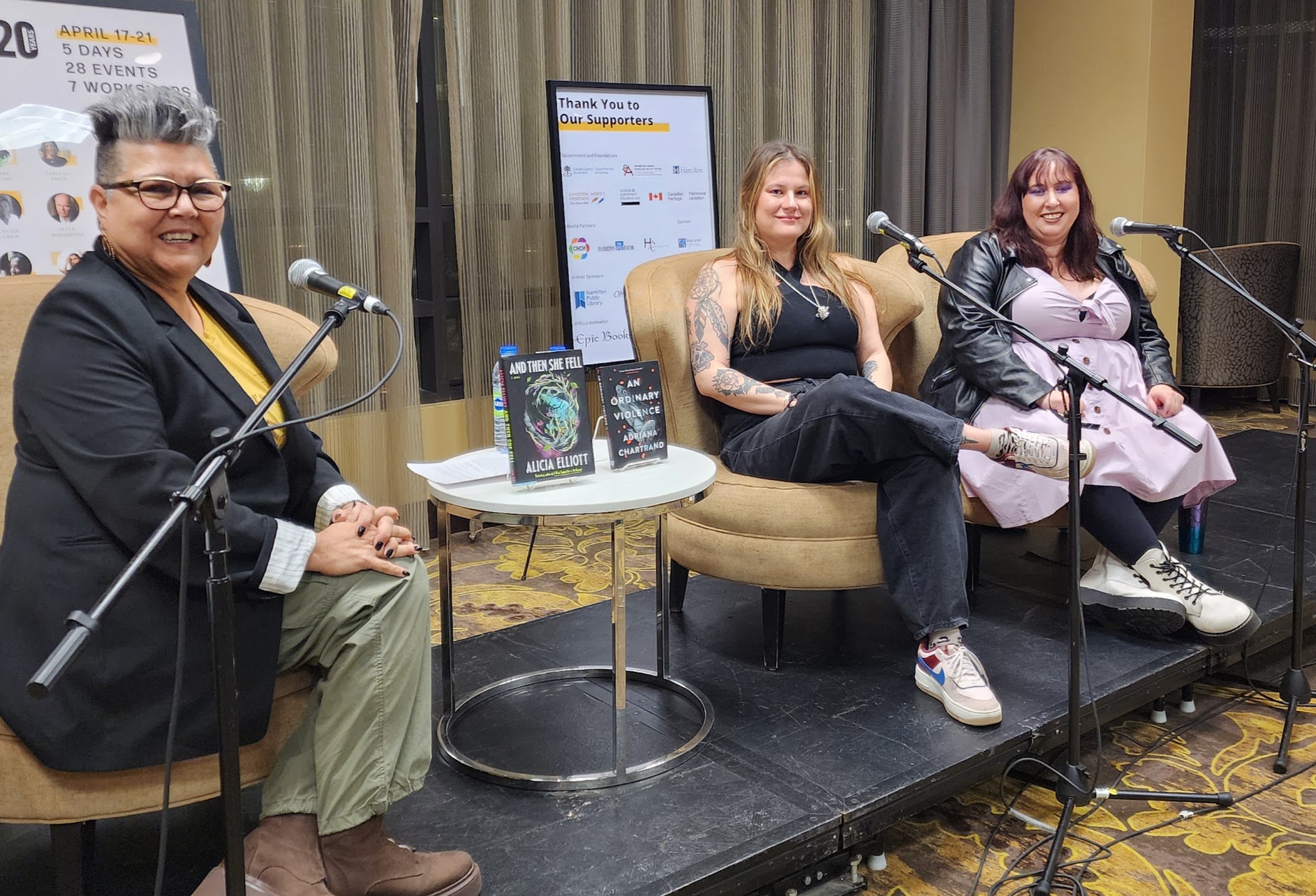 Photo 1: “Words Collide” with January Rogers (moderator), Adriana Chartrand (An Ordinary Violence), and Alicia Elliott (And Then She Fell). Photo 2: “Falling Short” with Carleigh Baker (moderator), Vincent Anioke (Perfect Little Angels), and Jessica Westhead (Avalanche).