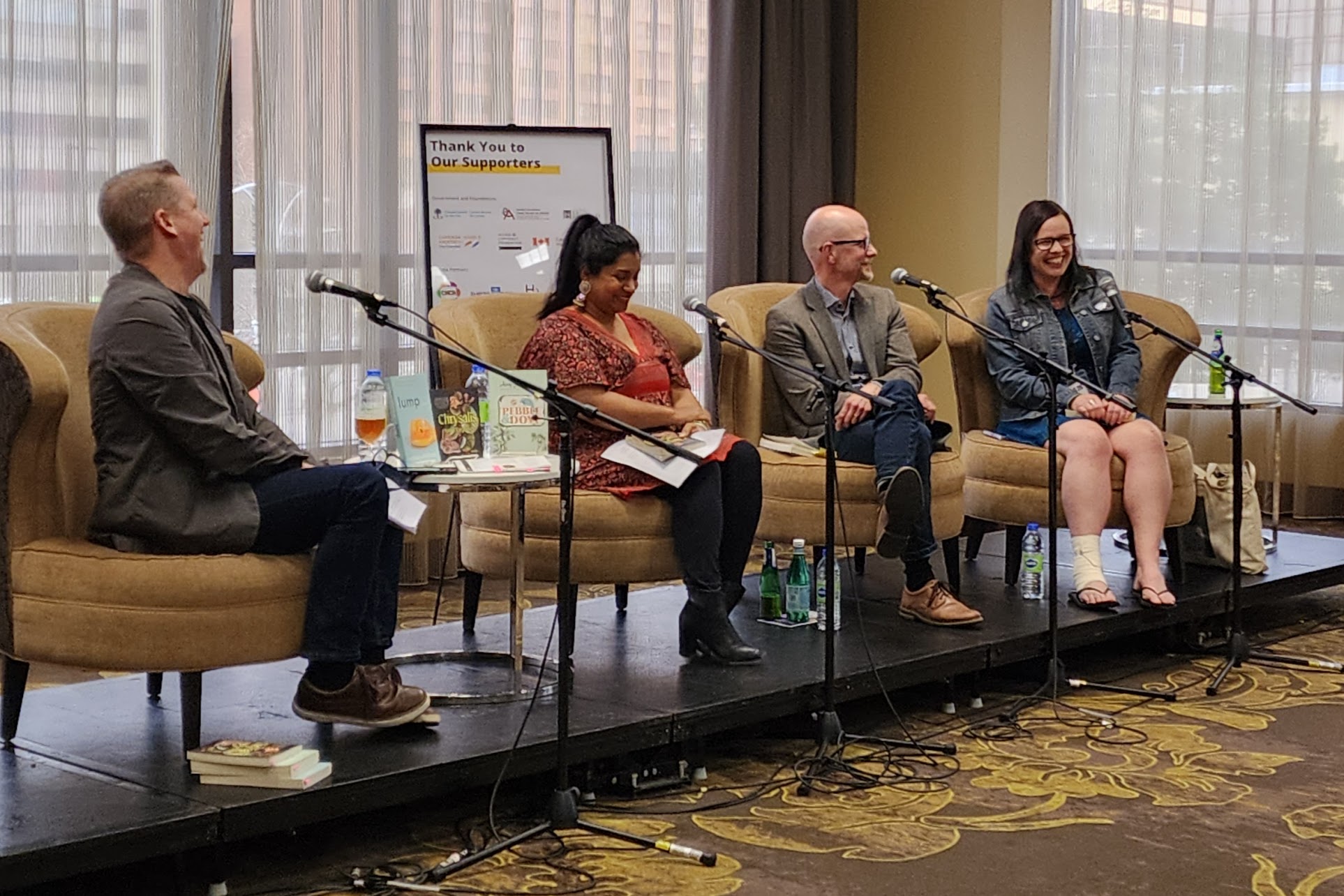 “Drafts & Drafts” with Brent van Staalduinen (moderator), Anuja Varghese (Chrysalis), Nathan Whitlock (Lump), and Amy Jones (Pebble and Dove).
