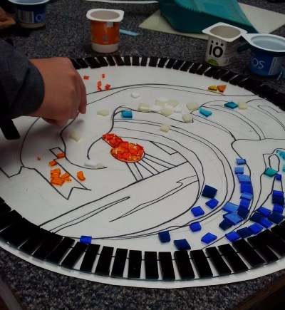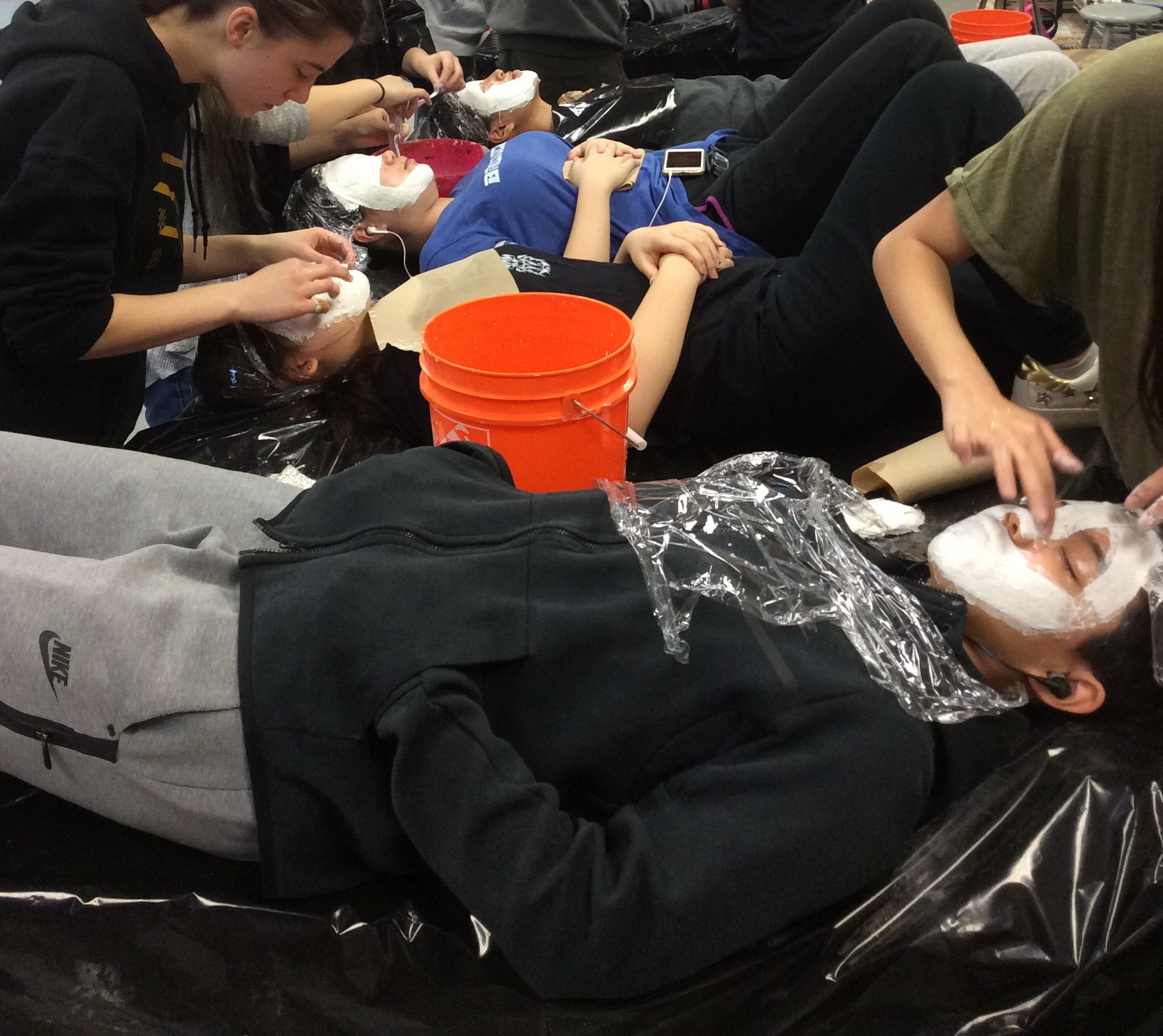 Despite the initial planning, the complexities of the project became evident. We took two field trips to Glasstronomy Studios where the ELL and AU students learned to cut and shape glass. During this trip students began creating their mosaic discs. The glass mask-making process applied students’ understanding of two-and three-dimensional modeling. As well, plaster casts were made of the ELL’s faces. This was a pure exercise of trust between our ELLs and art students! ELLs had to lie still as their partners coated their faces with Vaseline before applying strips of plaster gauze to their entire face. After a lengthy and technically challenging process, the final product was a life-sized mask of the ELL’s face with facial features rendered in clean black lines.